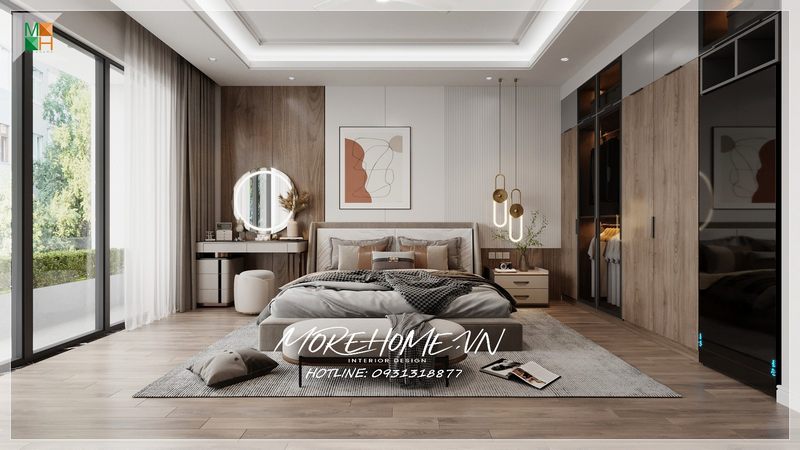 Sự kết hợp giữa gỗ và cánh kính tủ quần áo âm tường kịch trần cũng mang điểm nhấn cho căn phòng bởi vẻ đẹp hiện đại, thông minh của thiết kế nội thất mang lại sự tiện nghi và gọn gàng.