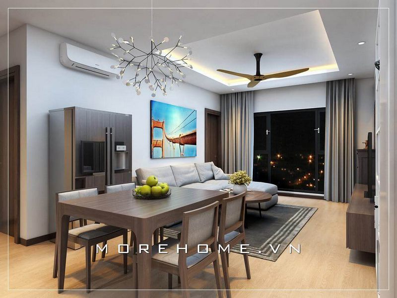 Với xu hướng thiết kế phòng khách liền phòng bếp ăn sử dụng đồ nội thất gỗ óc chó trong phong cách Á Đông nhưng nếu kết hợp khéo léo bạn sẽ tạo nên không gian hài hòa, thông thoáng như với căn hộ chung cư trong đây.