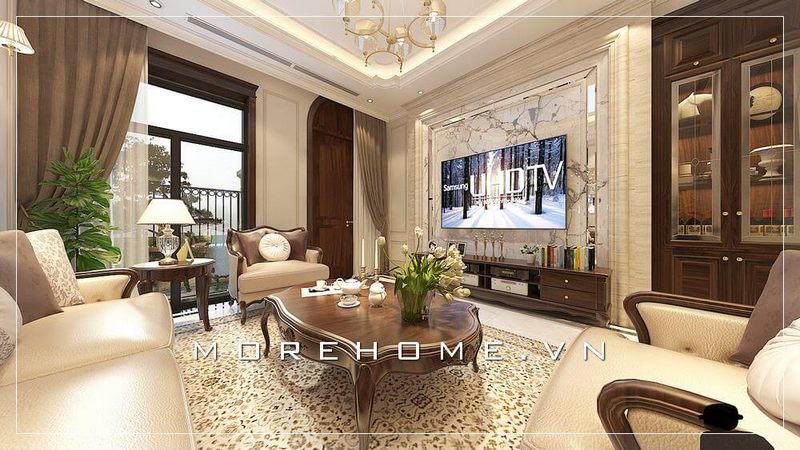 Sự bày trí đồ nội thất theo phong cách tân cổ điển đã tạo nên nét đẹp độc đáo, sang trọng, quý phái cho không gian phòng khách đặc biệt với các loại hình nhà như biệt thự, nhà phố.