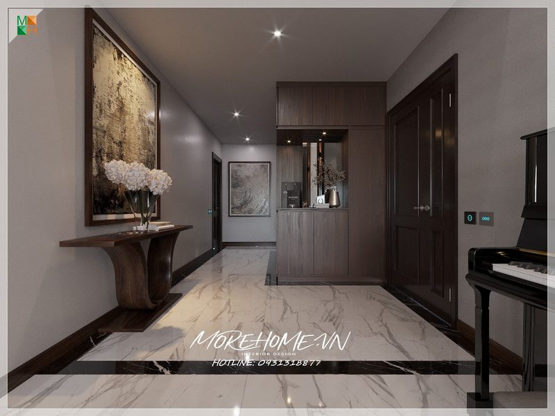 Ý tưởng thiết kế hành lang đẹp kết hợp độc đáo giữa đá lát nền, phào chỉ tường, đèn trang trí.