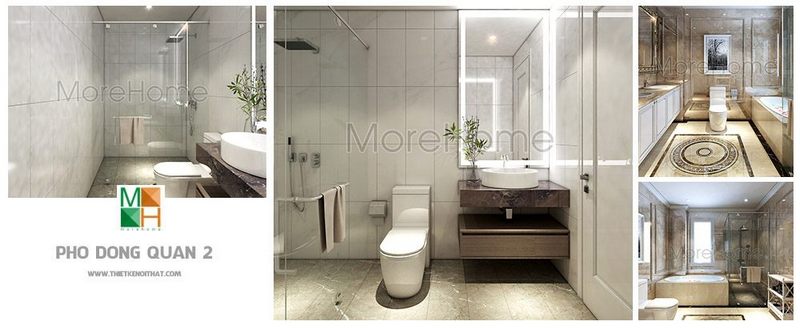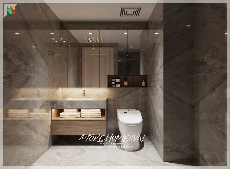 Phòng tắm được thiết kế đẹp với sự kết hợp của gạch ốp lát vân mây màu sáng và nội thất tiện nghi.