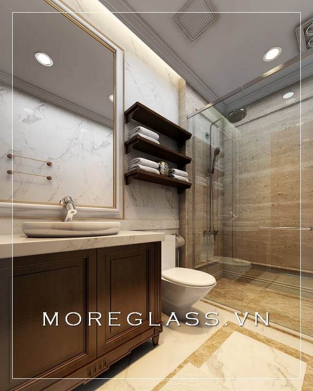 Mẫu phòng tắm được thiết kế với khu vực tắm được bố trí riêng biệt bởi vách kính tắm cường lực cao cấp, giúp ngăn văng nước, luôn giữ cho phòng tắm khô ráo và sạch sẽ.