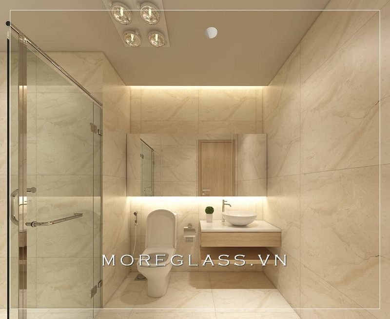 Vách kính tắm cường lực cũng được sử dụng ở không gian góp phần tạo cảm giác cơi nới cho không gian phòng tắm của gia chủ